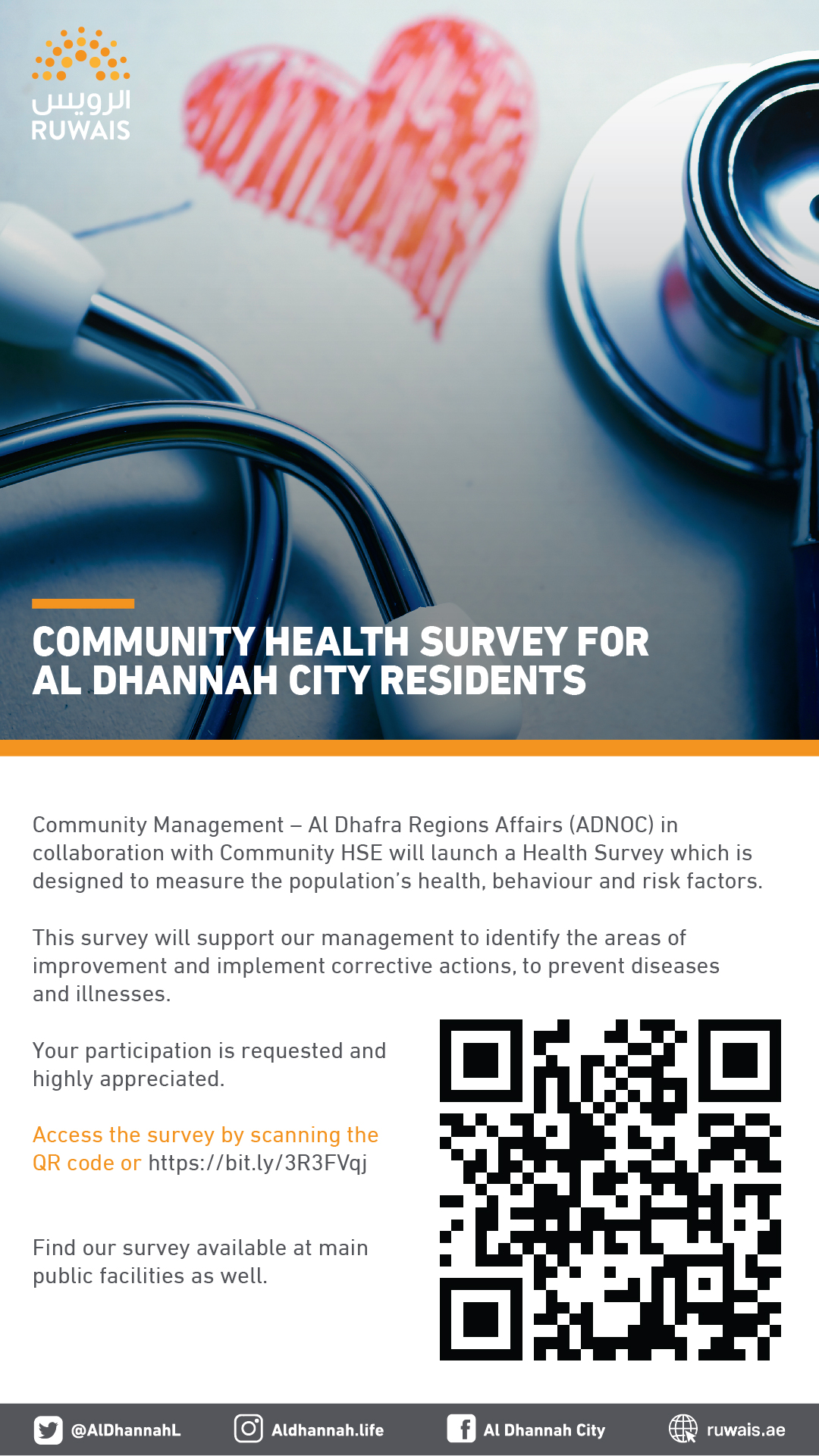 Community Management – Al Dhafra Regions Affairs (ADNOC) in collaboration with Community HSE will launch a Health Survey which is designed to measure the population’s health, behavior and risk factors.