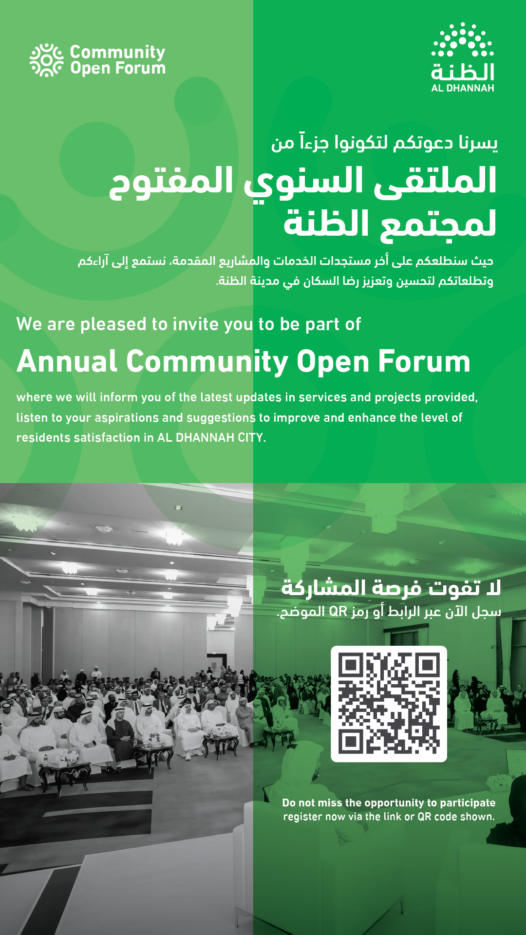 We are pleased to invite you to be part of the Annual Community Open Forum, where we will inform you about the latest updates on the services and projects provided, listen to your opinions, and discuss your aspirations and suggestions to improve and enhance all living experiences in Al Dhannah City.